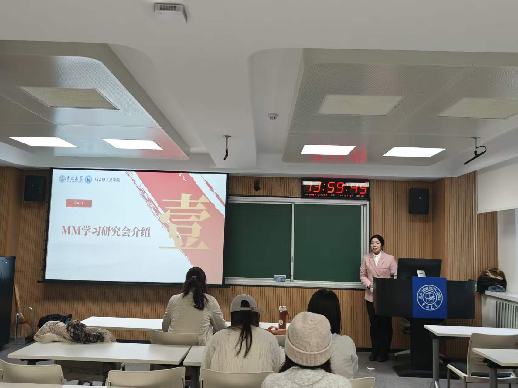 刘盈利同学对M·M学习研究会做基本介绍。围绕“什么是M·M理论学习研究”“为什么要进行M·M理论学习”“如何将M·M理论转化为实践”三大核心问题展开系统介绍。开展M·M理论学习,既是把握时代发展规律、增强“四个自信”的理论需求,也是马院学子筑牢信仰根基、践行青年使命的必然选择。在实践层面,负责人也为成员们明确方向:要依托马院学科优势与师资力量,夯实学术根基,提升研究专业性和前瞻性。
