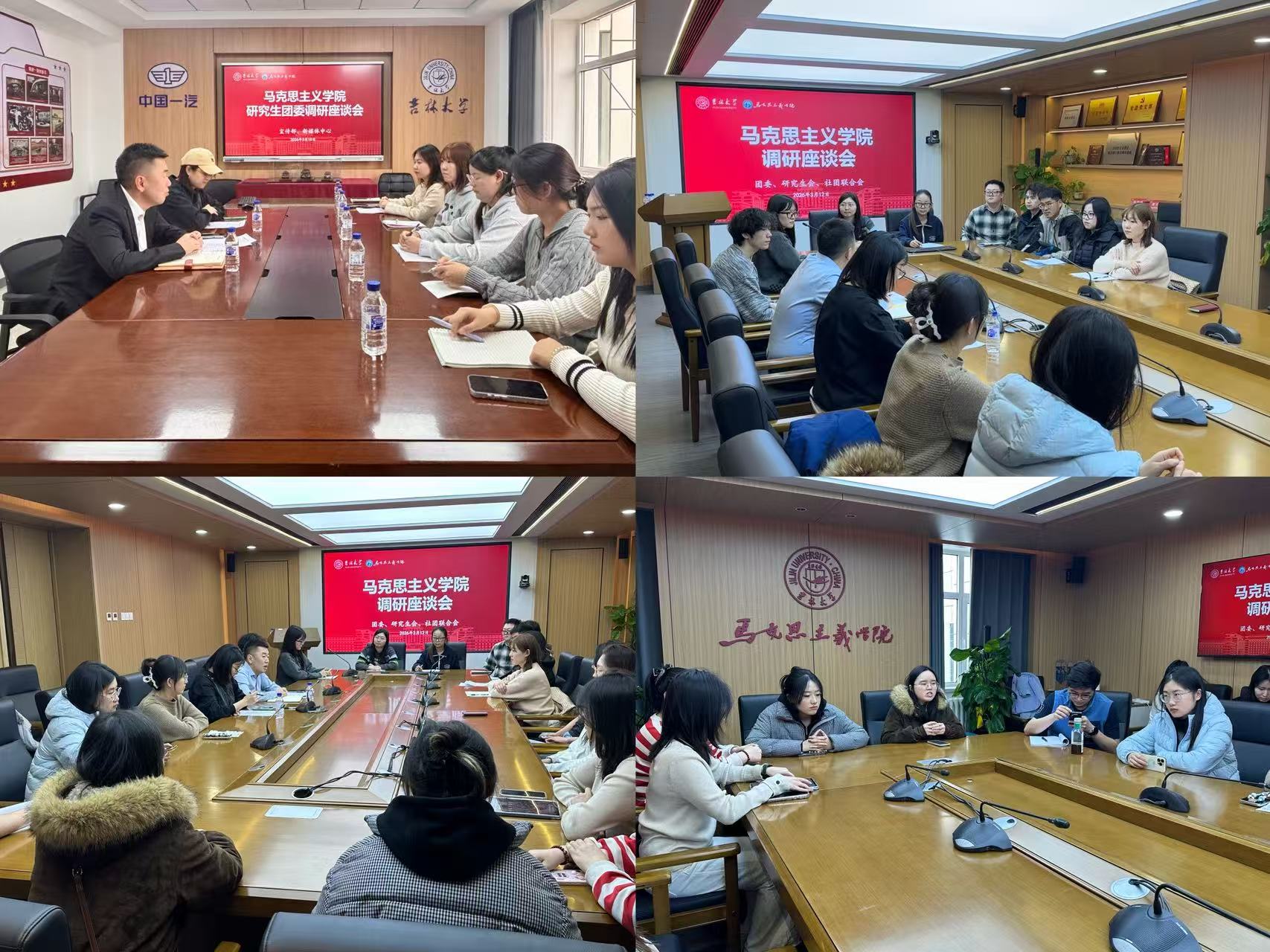 在团委、研究生会、社团联合会调研座谈会上,各部门负责同学依次作工作总结,其中团委毛小文同学回顾了去年开展的春日摄影作品展播和红色观影活动,表示获得了良好反响,今年将再接再厉;社联张晋豪同学提到要深化“青马知行论坛”、“经典诵读会”等马院特色社团活动。此外,还有同学建议举办校园荧光夜跑,在强身健体的同时增进同学间的交流与友谊。