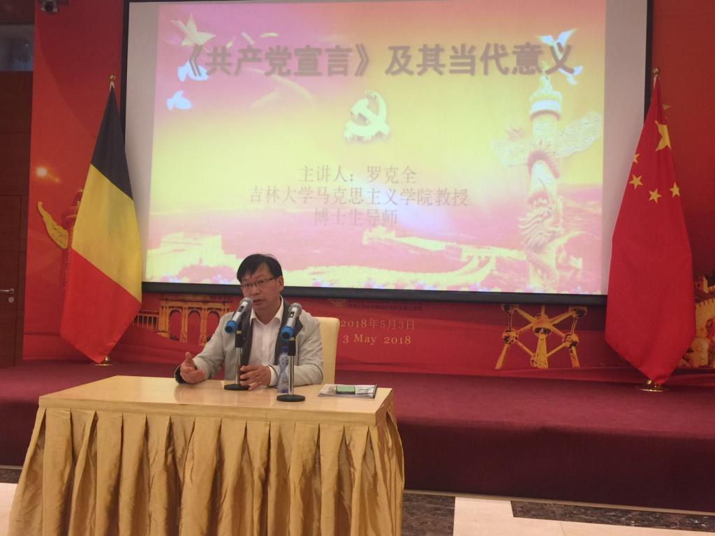 在参加《纪念马克思诞辰200周年暨马克思主义在中国的实践》(布鲁塞尔)研讨会(5月3-5日)期间,成人论坛罗克全教授应中国驻比利时大使馆的邀请,给我国驻比利时大使馆外交人员作了题为《<共产党宣言>及其当代价值》的报告会。罗教授首先总括性地介绍了《共产党宣言》的主要思想,让人信服地论证它在当代世界发展中的价值。最后,联系《共产党宣言》说明了中国新时代发展在“人的解放”进程中的重要意义。主持报告会的中国驻比利时公使衔参赞张弛评价说,罗教授的演讲开阔了中国驻比利时使馆工作人员马克思主义理论的视野,是使馆工作人员的一次马克思主义思想认知上的启迪。