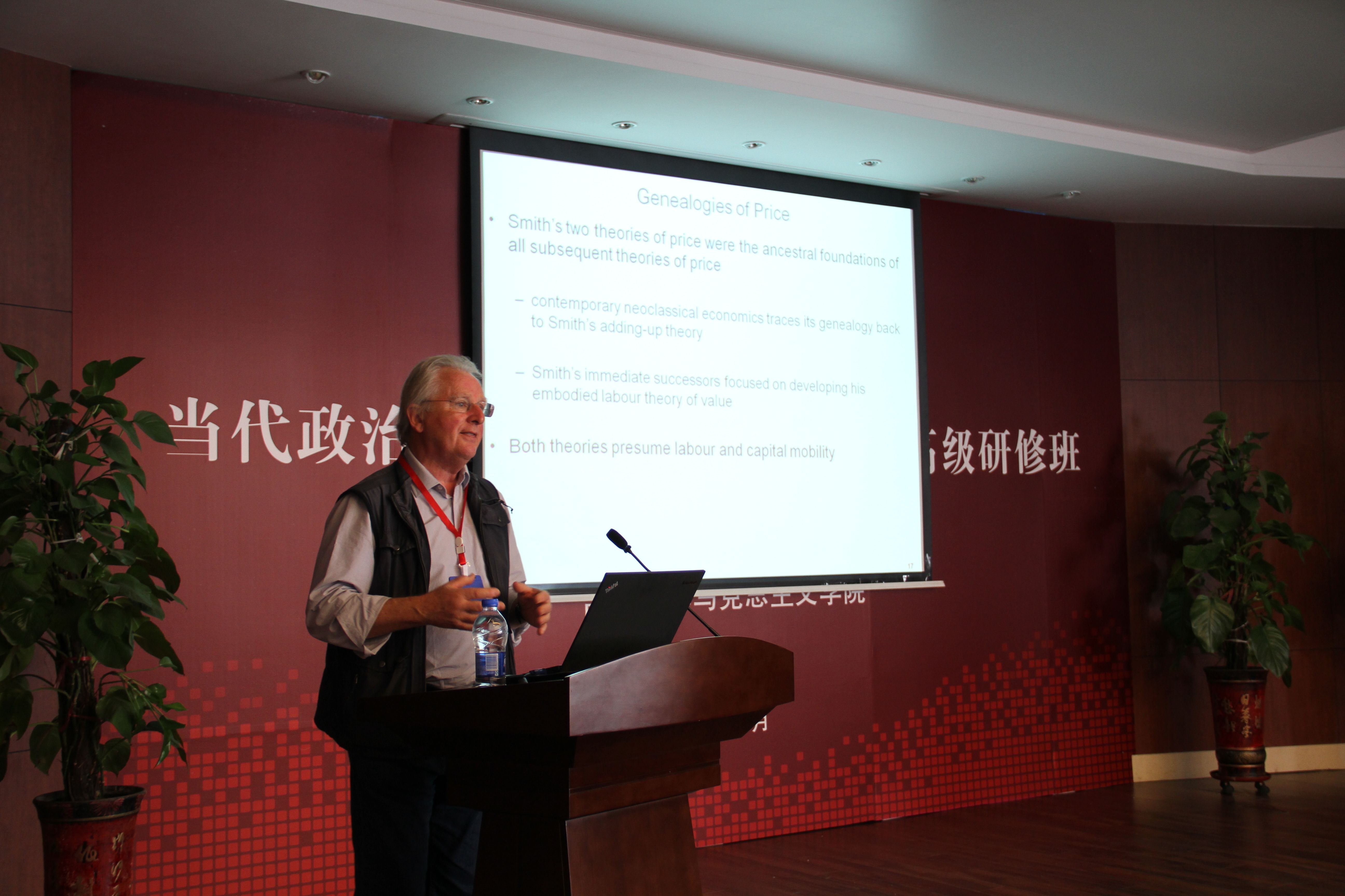 开幕式结束后,研修班课程正式启动。第一位主讲嘉宾是来自英国伦敦大学女王学院政治经济学专业的Simon Mohun教授,他围绕马克思主义政治经济学中的价值与价格内容,为学员进行了详尽的讲解,讲述了斯密、李嘉图、马克思的主要思想成就与递进发展,并对学员的提问进行了细致耐心的回答。下午,由德国不莱梅大学从事创新与制度经济学研究的Wolfram Elsner教授讲授异端经济学之复杂经济学及其政策含义,其内容包括复杂经济学的动态、进化和涌现性,组织机制中的HET以及异端学说,平衡经济学及其政策等前沿理论。当天晚上,来自德国杜伊斯堡-埃森大学的代栓平教授为学员讲解政治经济学与实验方法,包含博弈论的内容以及诸多经济学理论在实际领域中进行妙趣横生的实践活动。