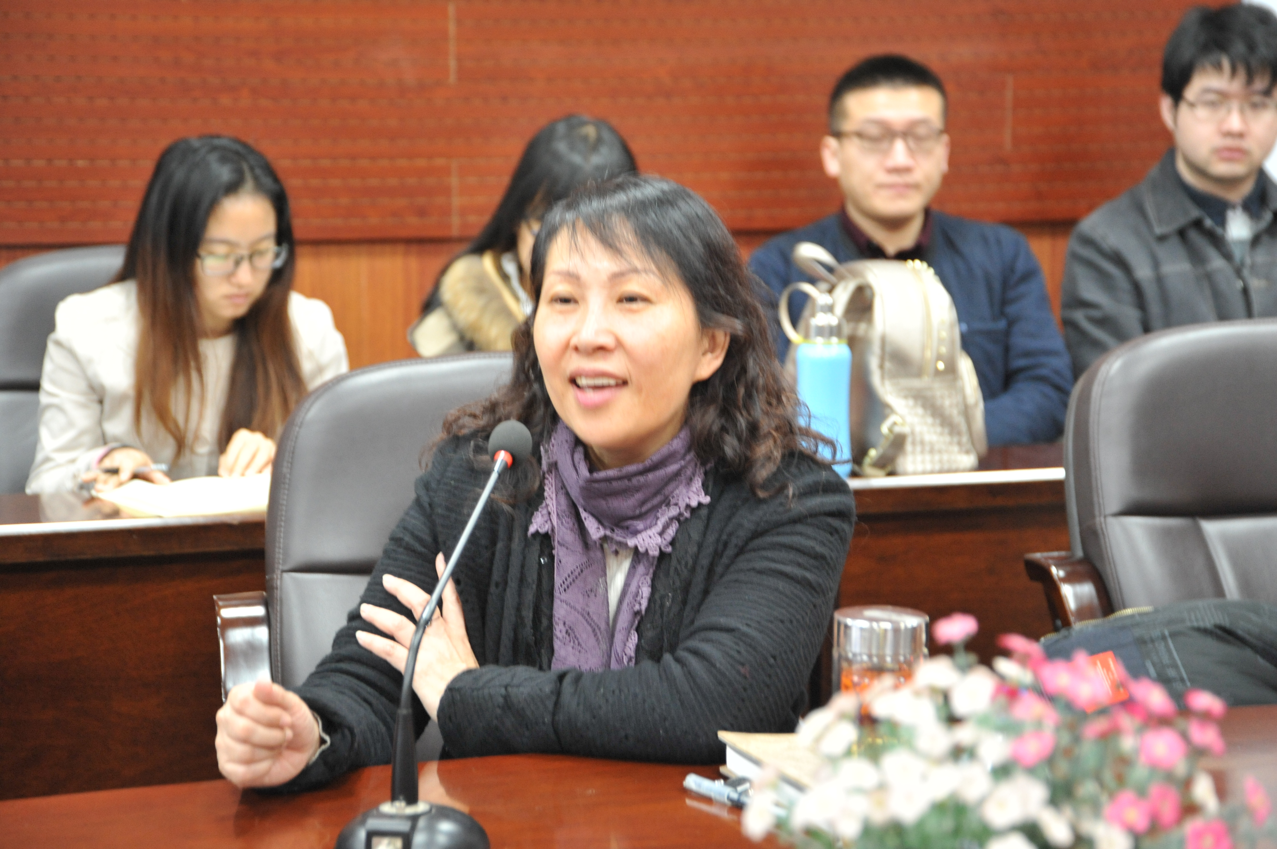 张艳梅教授以《美国高等教育管窥》为题讲述了她在美国范德堡大学访学的经历。从范德堡大学的概况到哲学系概况,从本科生教学到研究生专业具体情况,从硬件设施到“软件”情况,从师资到学生,从课程设置到作业考试,张老师都作了详尽地介绍。石瑛教授在韩国梨花女子大学访学,她结合中国发展的实践,以熟悉与重新认识:韩中互鉴的视野、民族与世界:韩国德育的两个比较和提升与超越:我的几点感悟等为视角,详细对比了中韩两国的德育状况。她认为,随着中国经济社会的发展,要逐步提升个人自身素质、坚持“四个自信”,以提升中国的文化软实力。刘姝副教授在美国Vanderbilt University访学一年。刘老师从“感受美国的简单”切入点,以丰富的图片内容就小学教育、高等教育向大家做了介绍,她结合自己的访学经历,分别就国家意识、课程学习、社会实践以及推进社会创新的方式,与在座的师生进行了交流。
