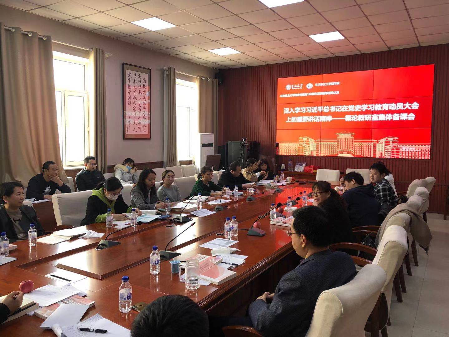 庆祝建党100周年系列教学活动之三:深入学习习近平总书记在党史学习教育动员大会上的重要讲话精神——概论教研室集体备课会在学院多媒体会议室召开。吴宏政院长、石瑛副院长、董树彬副院长以及概论教研室全体教师参加了会议。